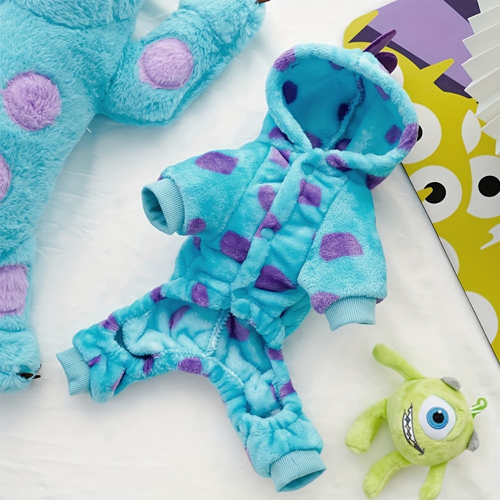 Pet Costume, Dinosaur Tail & Wing Halloween Outfit, Cats Blue Plush Cozy Hoodie with Purple Polka Dots, Snaps & Leash Holes, Hand Wash Only, Polyester, for Small to Medium Pets, Knit Fabric